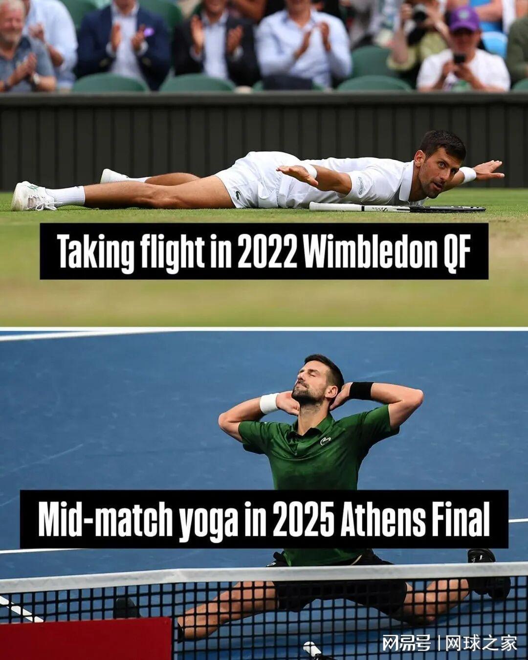 2025年温网,德约科维奇达成了在温网赢得100场胜利的纪录,他在赛后再次作出劈叉动作。2025年雅典站,德约科维奇在比赛中赢下一分后临时起意做出一字马劈叉动作。